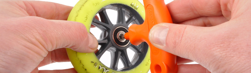 2. Baue die Lager aus deinen Rollen aus. Bei Rollen mit 8mm Spacern musst du mit einem geeigneten Werkzeug das Lager aus der Rolle ziehen. Durch leichtes Verkanten löst sich das Lager so aus der Rolle.