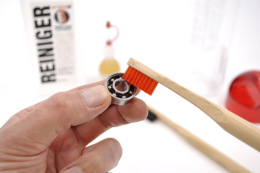 3. Die geöffneten Lager in ein spezielles Reinigungsbad (siehe Kategorie Pflegemittel) legen und einige Zeit einwirken lassen. Eventuell mit einem Pinsel gründlich auswaschen.